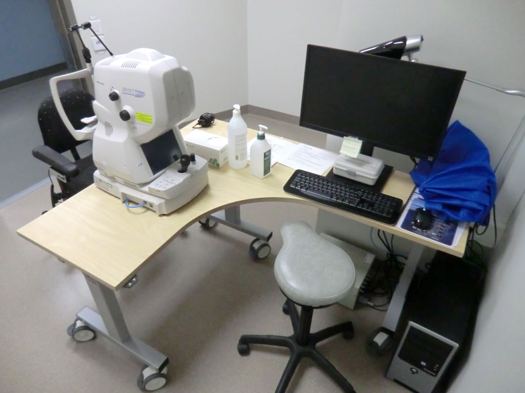 Undersökningsbord för ögon. Höj & sänkbart, med utskjutbar skiva för undersökningsinstrument. Bordet